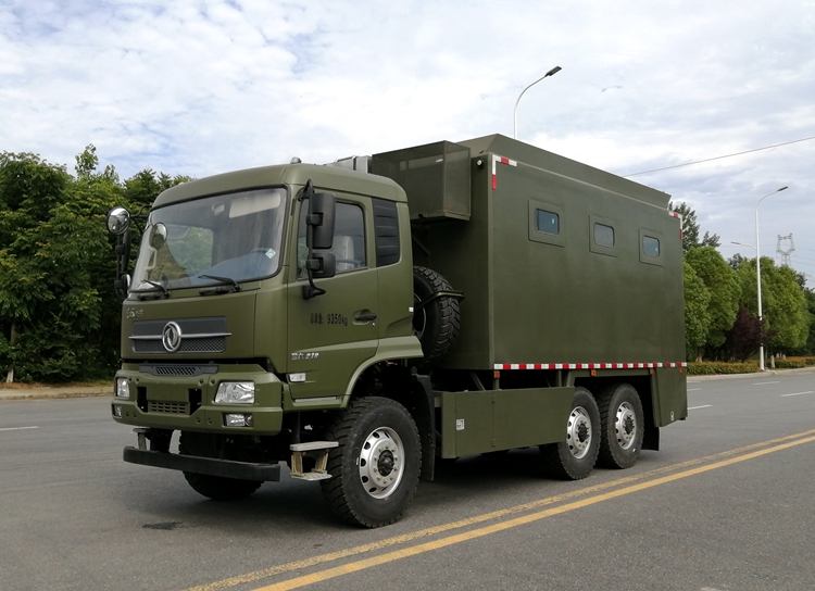 程力威牌CLW5090XZC6RL型野外自行式炊事車——六驅越野炊事車由東風6*6越野底盤加炊事方艙兩部分組成,該車...