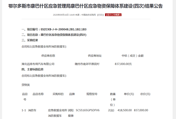 喜訊!康巴什區(qū)應(yīng)急物資保障體系建設(shè)—中標(biāo)2臺(tái)越野消防車(chē)